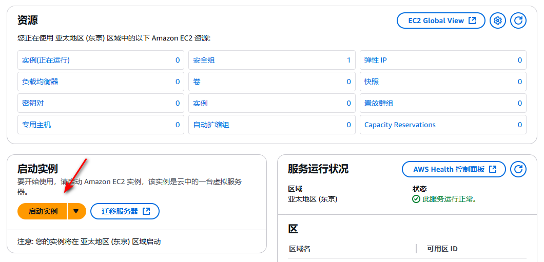创建好免费云服务器后,可以在左上角『计算 – EC2』页面,找到『实例(正在运行)』,点击可打开实例管理页面: